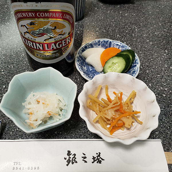 周りで一杯やっているお客の姿に触発されてビールをお願いした。700円と銀座価額ではあるが、なますときんぴらがお通しとして供されるので納得が行く。それにしても純和風のお通しというのはミスマッチで面白い。いずれも丁寧に作られたものなので期待が膨らむ。