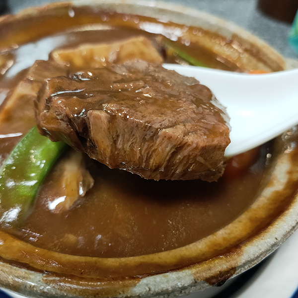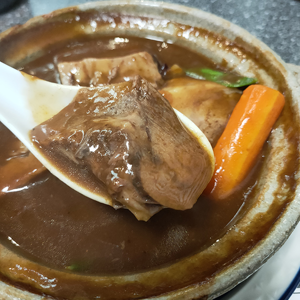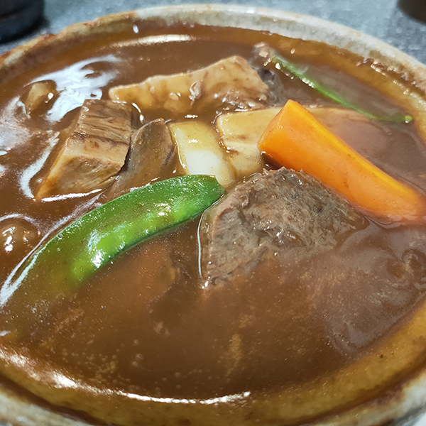 牛肉は簡単にほどけるほど柔らかく、味もよく染み込んでいる。しかし、デミグラスソースで煮込まれたと言うよりはブイヨンで煮込まれたイメージに近いため軽い。