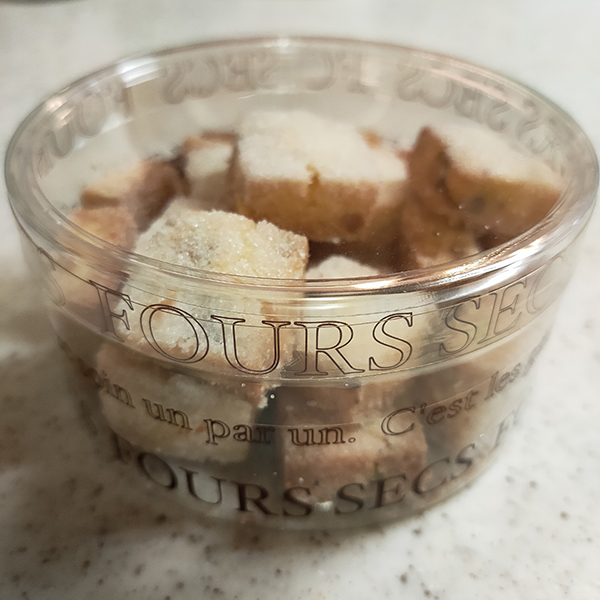 持ち帰った直後はすこしぺっしゃっとしていたが、温風調理器で少し温めるとパリッとした本来の姿が蘇った。サクサクと歯切れよく、べたつきも少ない。バターの香りのバランスがよく秀逸。
