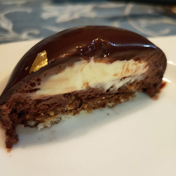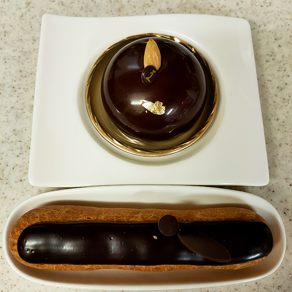 ただし、あまりクレームブリュレの存在は感じられない。むしろビスキュイのサクサク感と濃厚なチョコレートの香りの方がインパクトがある印象だ。リキュールの香りも強く感じられ、香りを楽しませてくれるタイプと言えそうだ。チョコレートの濃厚さはむしろエクレールの方が強いように思う。