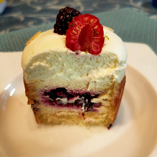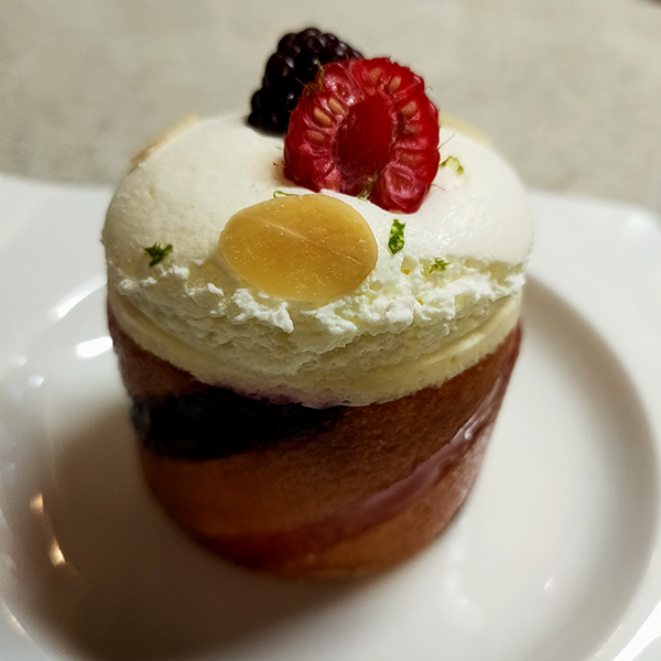 ビスキュイジョコンドにライム風味のチーズのムース、中央にはカシスのジュレをあしらったもの。