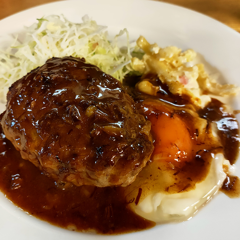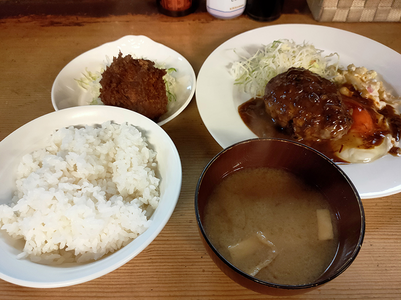 ハンバーグはしっかりと厚みがあるタイプでクリームコロッケはごろんとした無骨な姿が印象的。