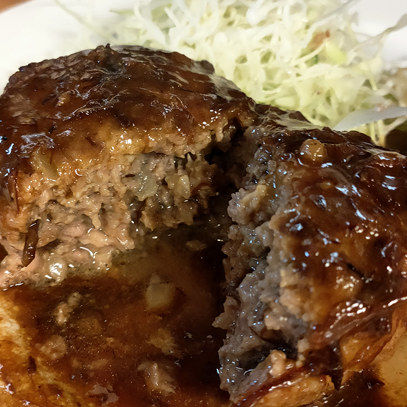 中心で2つに分けると肉汁が溢れ出す。黒毛和牛と謳っているだけに、お肉を食べている感が強い。