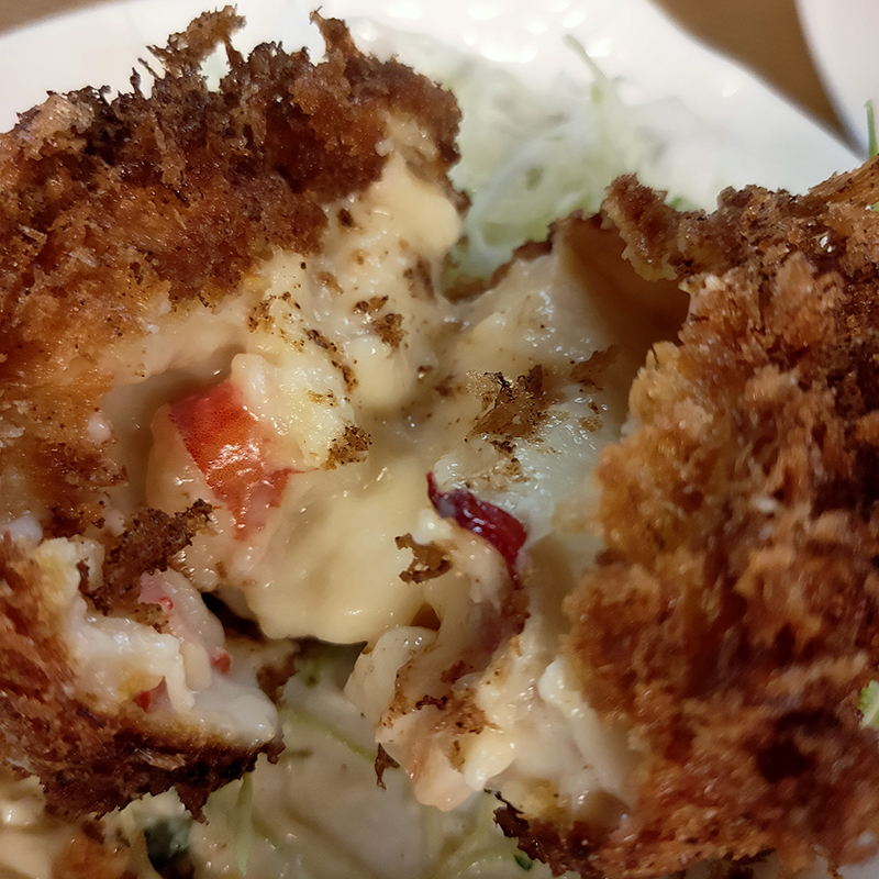 粗めのパン粉をまとった衣はサックリと油切れがよく、中のベシャメルソースは粘性の高いねっとりとした食感。そして何よりカニが濃厚に香る。流石に人気メニューだけのことはある。