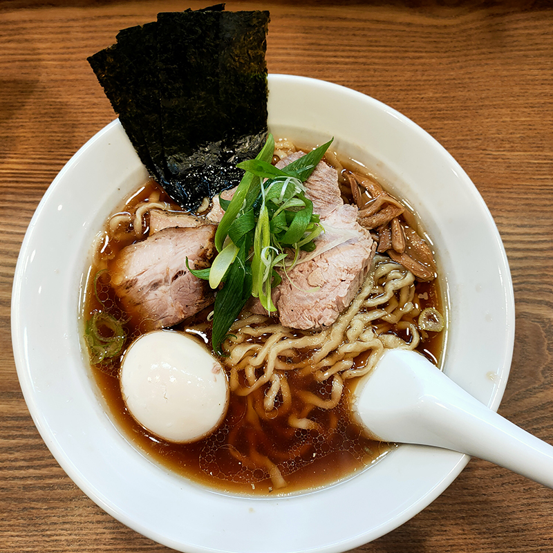 具材は九条葱、メンマ、チャーシュー、煮玉子、のりとシンプルな構成。
