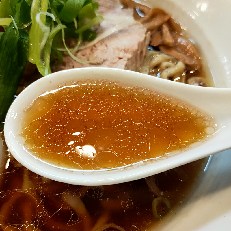 スープは透明度が高くレンゲですくってみると、丼越しで見るより醤油の色が薄い。