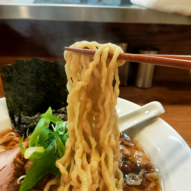 平打のちぢれ麺は弾力性があって粉の旨味が感じられる。このタイプのスープにしてはかなり太い麺ではあるが、ちぢれている分、スープにもよく馴染む。