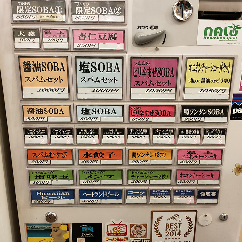 メニューを見るとまず目に飛び込んでくるのがスパムセットの文字。周りを見渡すと半数くらいが注文している様子。スパムがそれほど好きではないが文字のインパクトに惹かれてスパムセットに。ラーメンは定番の他にも、季節限定メニューもあるようだ。