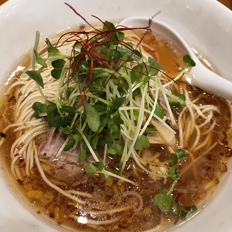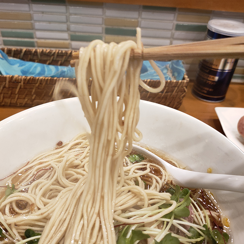 麺は茹で時間は20-30秒ほどとかなり早い。エッジが効いた小気味いい食感の茹で加減。小麦の風味が高く、スープとの相性もいい。
