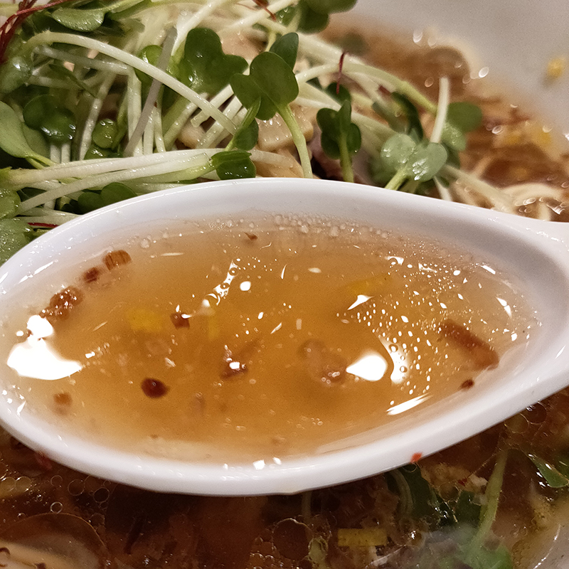 スープは焦がしネギが入っているのが特徴的で、永楽や喜楽のスープとは異なり醤油の色は薄い。かなり軽やかなスープだが、焦がしネギが、いい塩梅にコクを補っている。