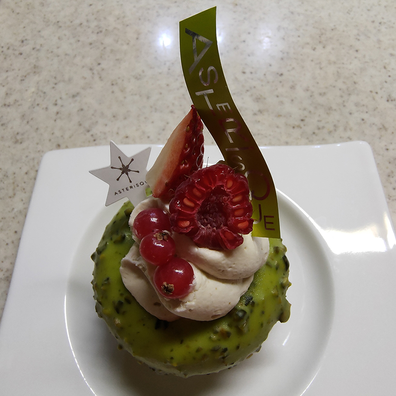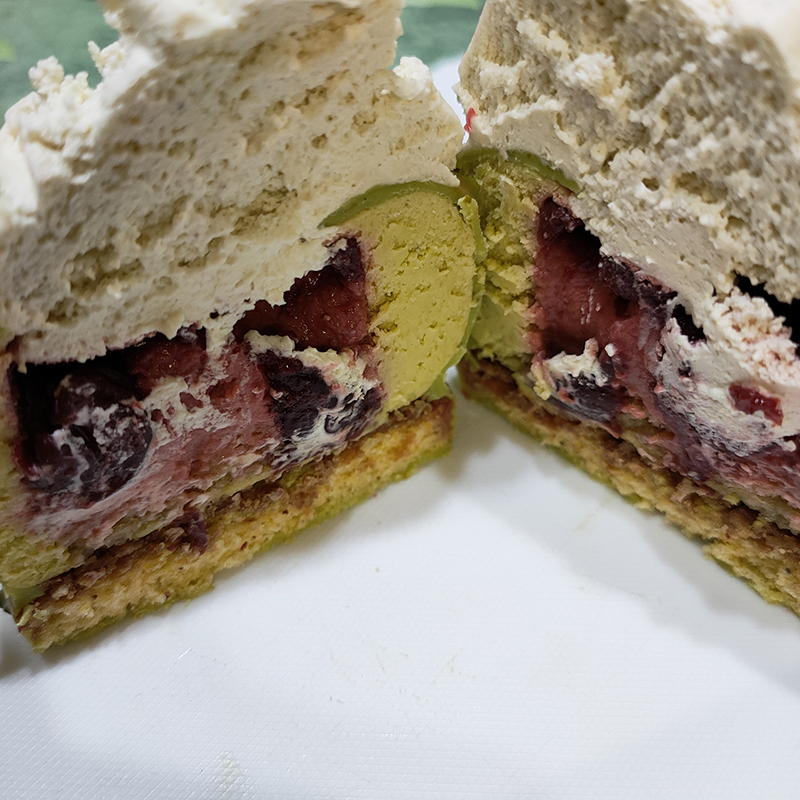 中にはピスタチオのムースとグリオットチェリーのムースとペーストが入っている。全体のバランスが秀逸で上に乗った生クリームを含め、どのパートも欠かす事ができないと思わせるほど高いレベルで均衡を保っている。