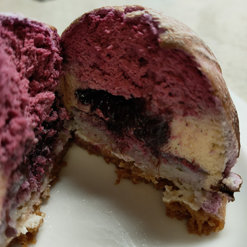 こちらもカシスのムースとジュレが2重の層になっていて、カスタードクリームのバニラの香りがいいアクセントとなっている。最下層に敷かれたサブレも香り高く、こちらも全体のバランスの良さに脱帽。