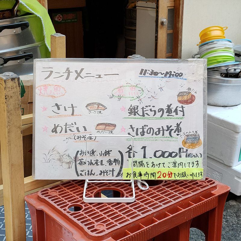 11:45店着で10人近い列。もうこの時間だから銀だらは無理だと思っていたのだが、まだ売り切れてはない様だ。しかし、先人たちが全員銀だらを注文。その結果、残念ながらあと2人というところであえなく終了。