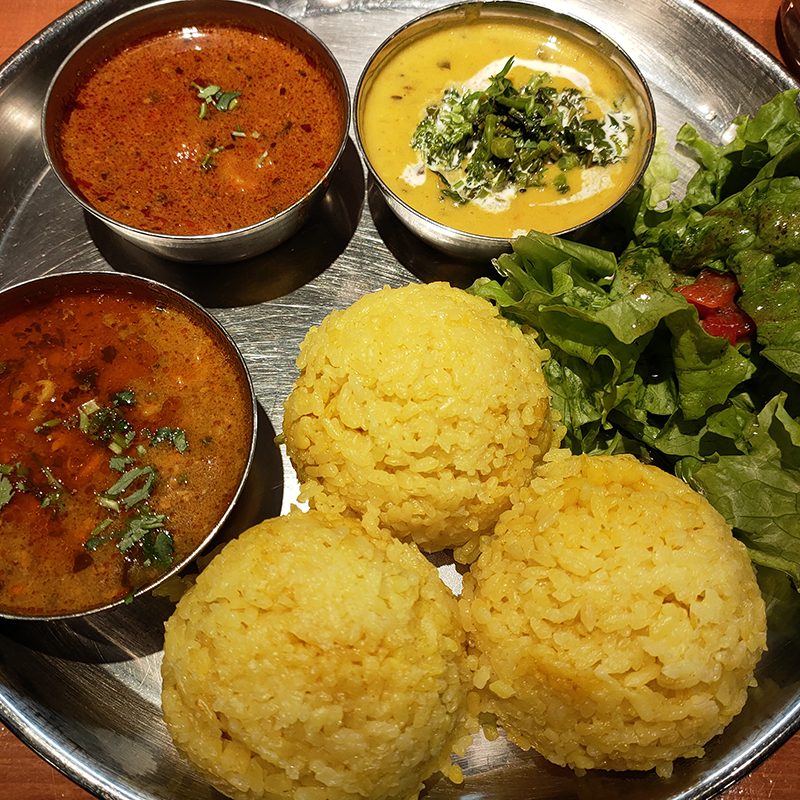 カレーが入った器と同じくらいのサイズのライスが3つ。全体のバランスからすると大盛りにする必要はなかったと少し後悔。