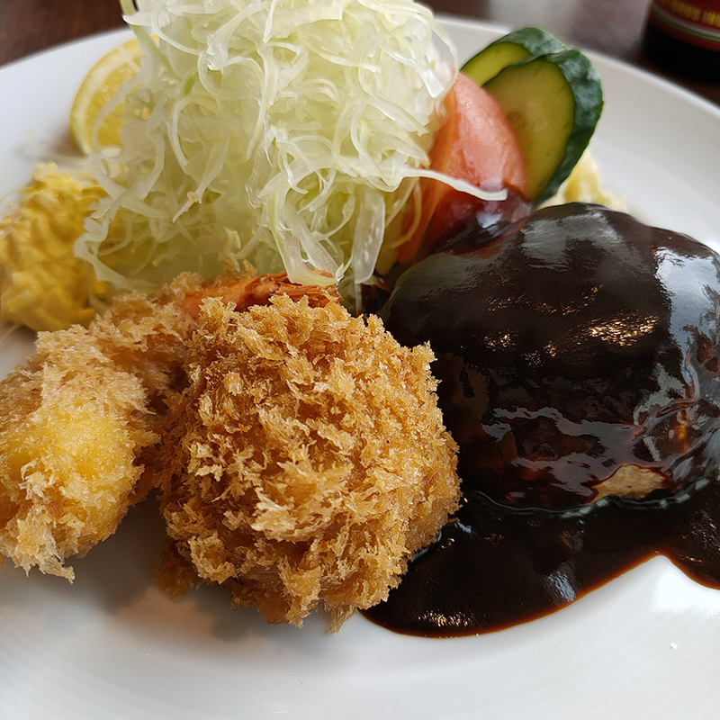 このデミグラソースは好みのタイプ。ポテトサラダも丁寧な仕事ぶり。