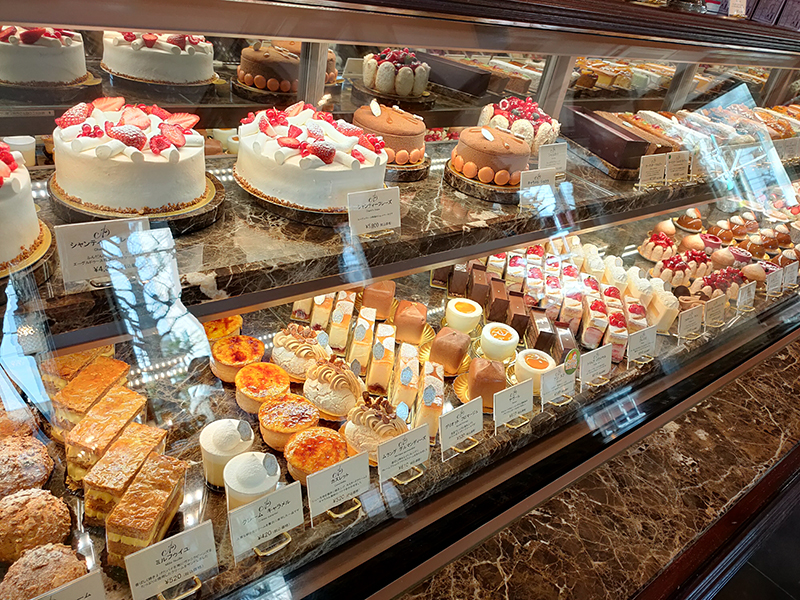 待ち時間は40分ほど。店内に入るとショーケースには色取りのケーキが目にも眩しい。