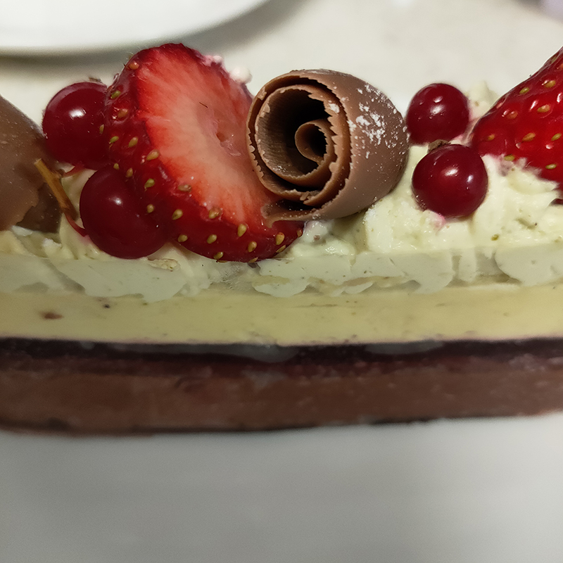 フォレノワールにピスタチオクリームのコンビネーション。フォレノワールとはフランス語で黒い森の意味で、ドイツのシュヴァルツヴァルト地方にある、針葉樹の森にちなんで付けられたもの。上に乘ったチョコレートが木の葉をイメージしているのだろう。