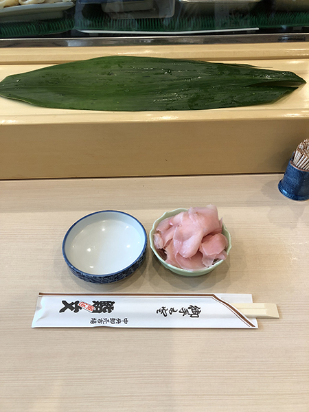 おまかせを注文すると笹の葉、ガリがセットされる。