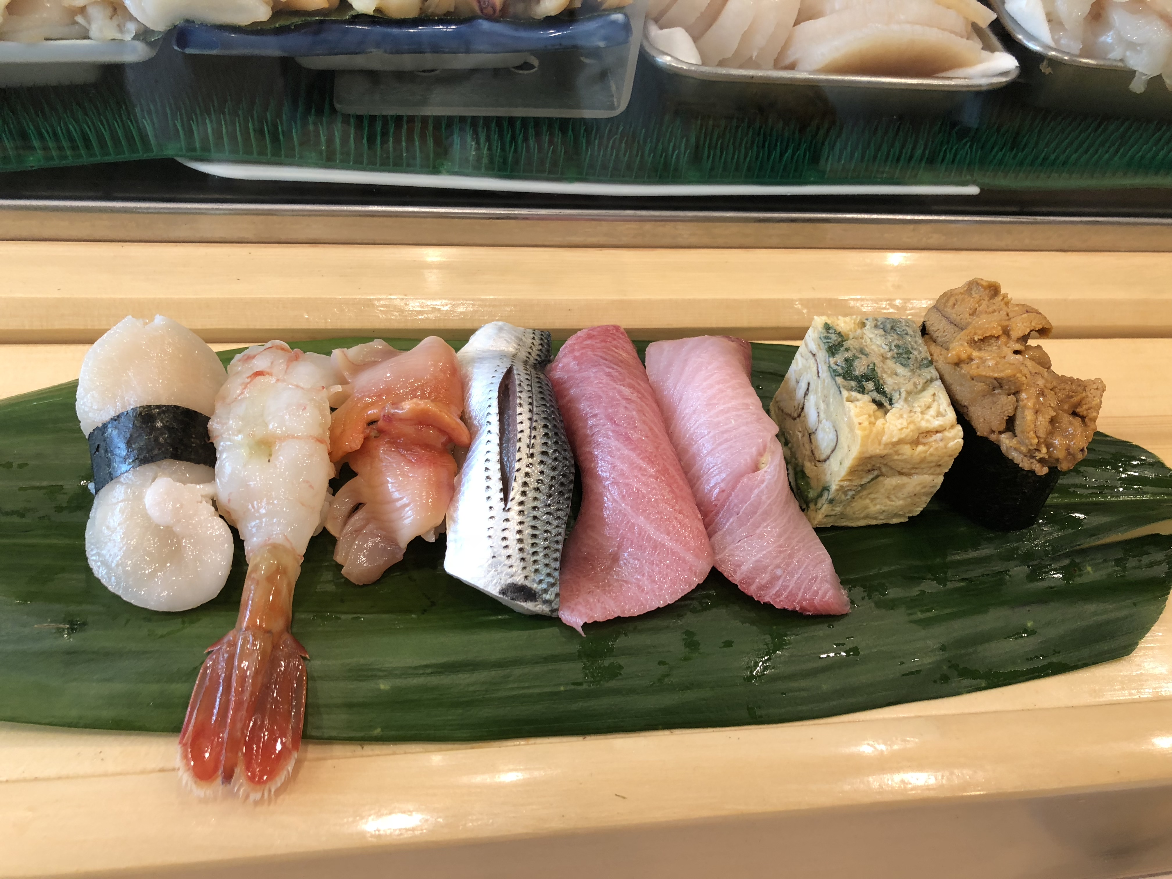 左から平貝、海老、赤貝、小肌、大トロ、ブリ、玉子、うにの順番。