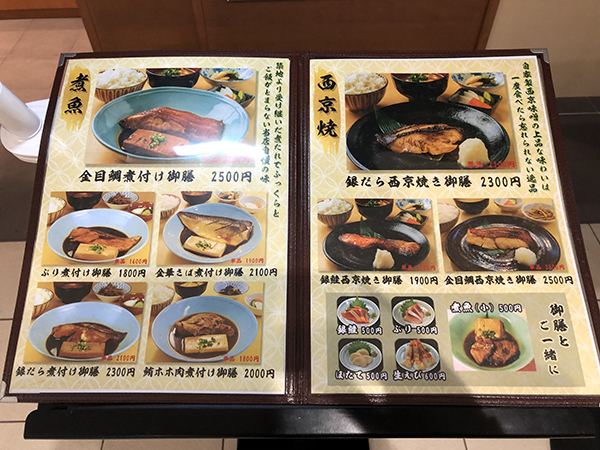 メニューは煮魚系と西京焼きなどの焼き物系の二本柱となる。