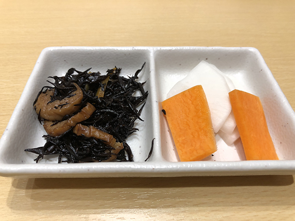 ほどなくすると、温かいお茶と共にお新香とひじきが入ったお皿が供された。