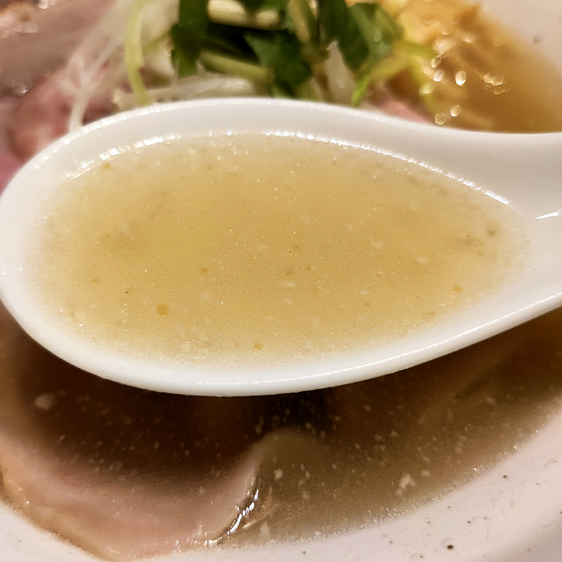 ただし、レンゲで掬ってみるとそこまで醤油寄りという訳でもなさそう。コクのある鴨出汁の旨味に負けないくらいしっかりとした塩ダレなので、塩気自体に物足りなさは感じられない。