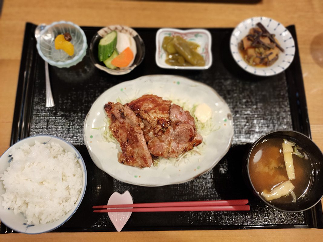 お盆の中央には主役のしょうが焼き、上部に小鉢が並ぶ。どれも手作りで、こういった心遣いが嬉しい。