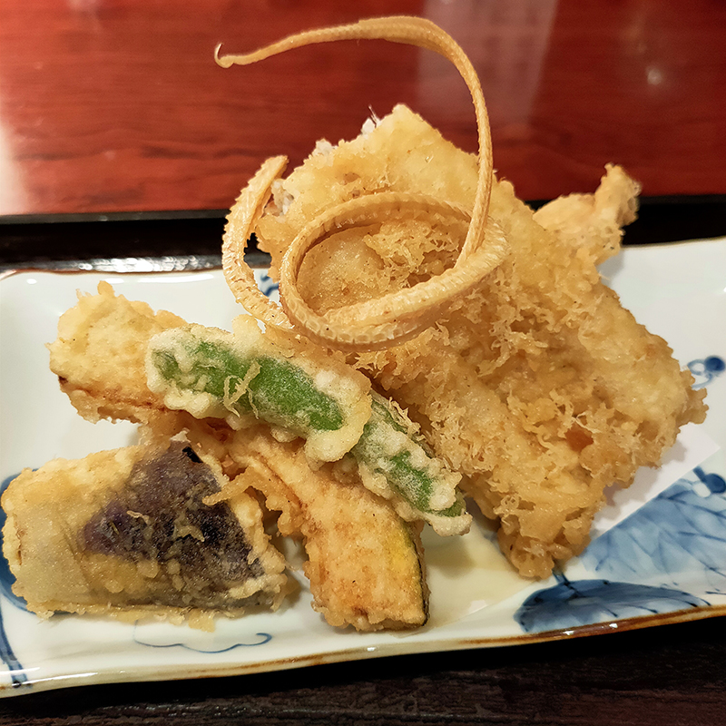 見た目にも美しい盛り付け。衣はサクサクと油切れも良く、おそば屋さんの天ぷらとしては上々の出来映え。朝〆めと書かれている様に臭みはまったくなく、想像以上に身も肉厚で大きい。