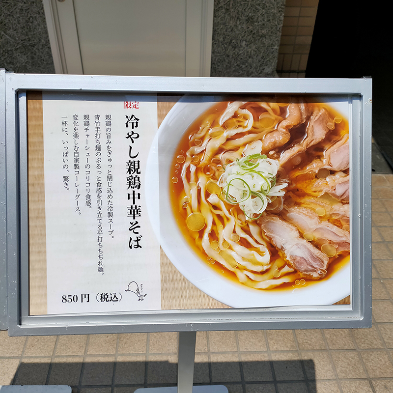 待っている間、店頭のメニューを見ると冷やしラーメンがあるではないか。この日は日差しが強く夏さながらの暑さ。となれば迷いはない。