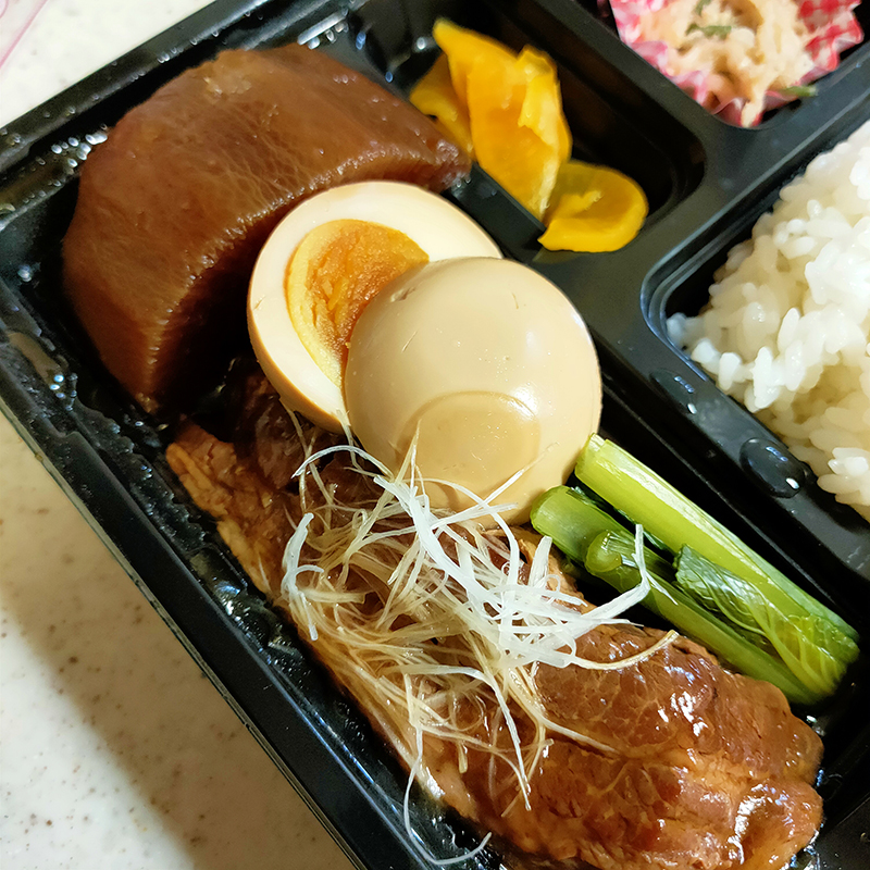 角煮は想像よりも大きいブロックが1つはいっている。豚肉とともに煮込む大根は濃厚な飴色。これも仕上げに投入する玉子までがセットになる。ごはんの量もしっかりとあり全体的にボリューム満点。