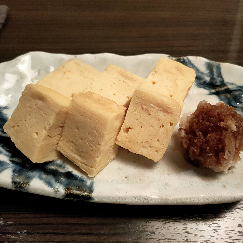 合いの手には玉子焼き。一度作ったものを温め直して提供するとのこと。切り口が妙にみっしりとしていて食感にかなりの違和感を覚える。出汁の香りや甘みなども希薄でちょっと微妙な感じ。
