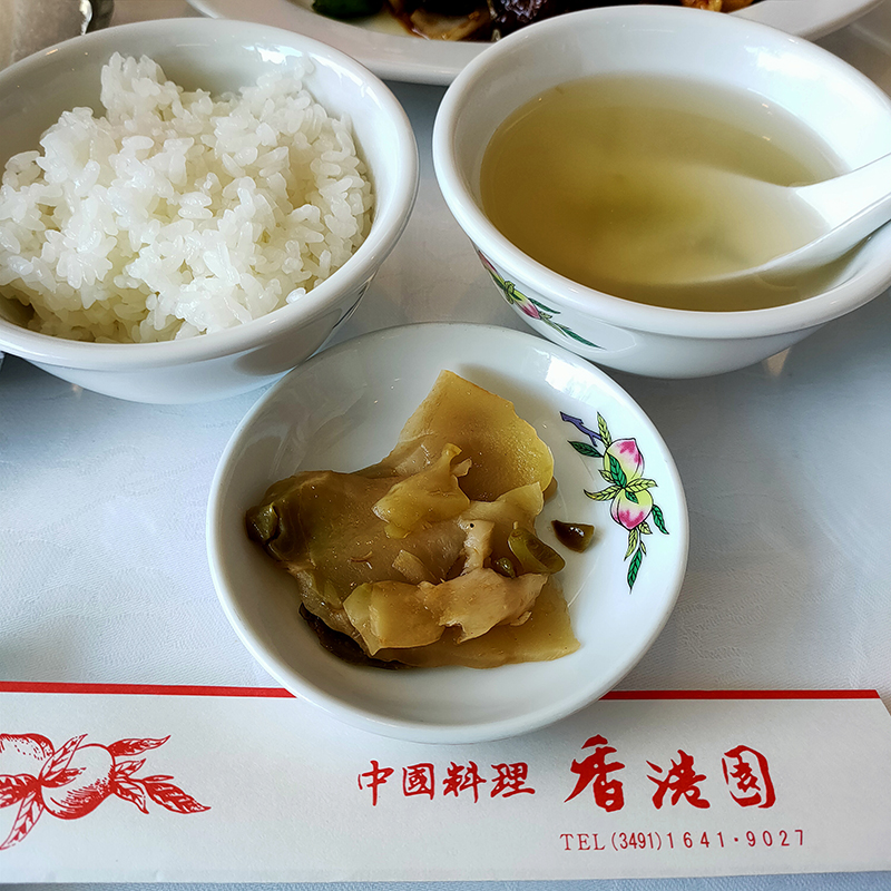 この日は3人で訪問し、少しずつシェアした。まず、ごはんとスープ、ザーサイが供された。