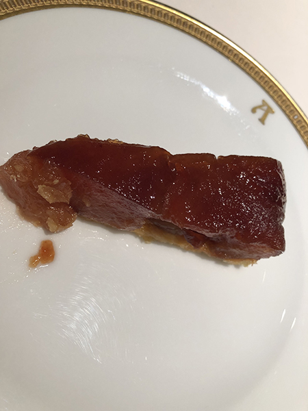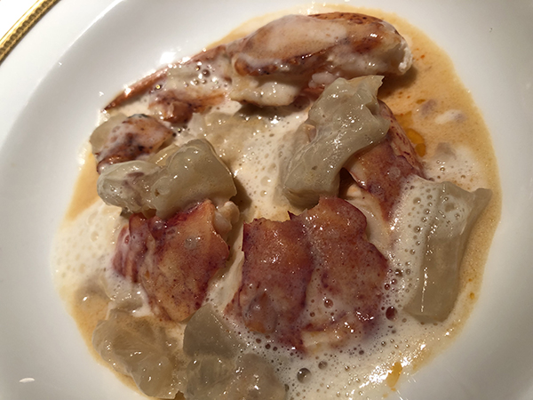 オマールの筋肉質な弾力性とジャレ・ド・ヴォーのゼラチン質の食感のコントラストがいい。たっぷりと注がれたブールノワゼットソースはほんのりとリキュールの甘みが感じられる。