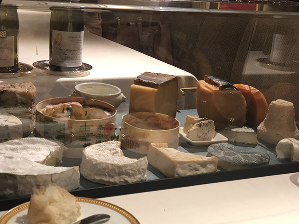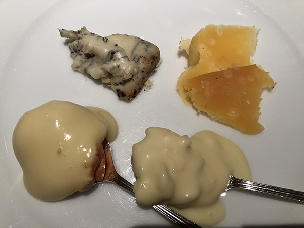 ワゴンサービスの中からジンで洗ったイタリア産のブルージン、エポワッス、モンドール、長期熟成のハードタイプのチーズを頂いた。