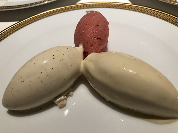 左から時計回りにバニラのアイスクリーム、紅玉のソルベ、胡椒のアイスクリーム