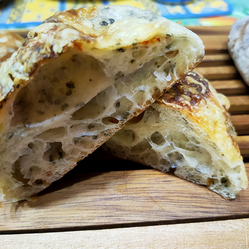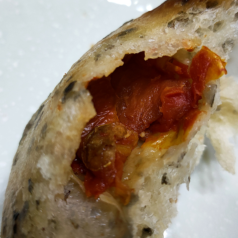 断面は気泡が多く、名前に反してトマトの存在が確認できない。むしろハーブを練り込んだパンといった面持ち。しかし薄い皮の内側の狭い場所にセミドライトマトが。