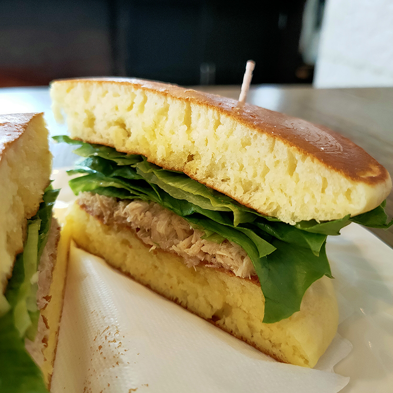 食事用のホットケーキは具材を挟むスタイルなのでバーグという名前がつく。パンケーキそのものがふんわりとして、ほの甘い。