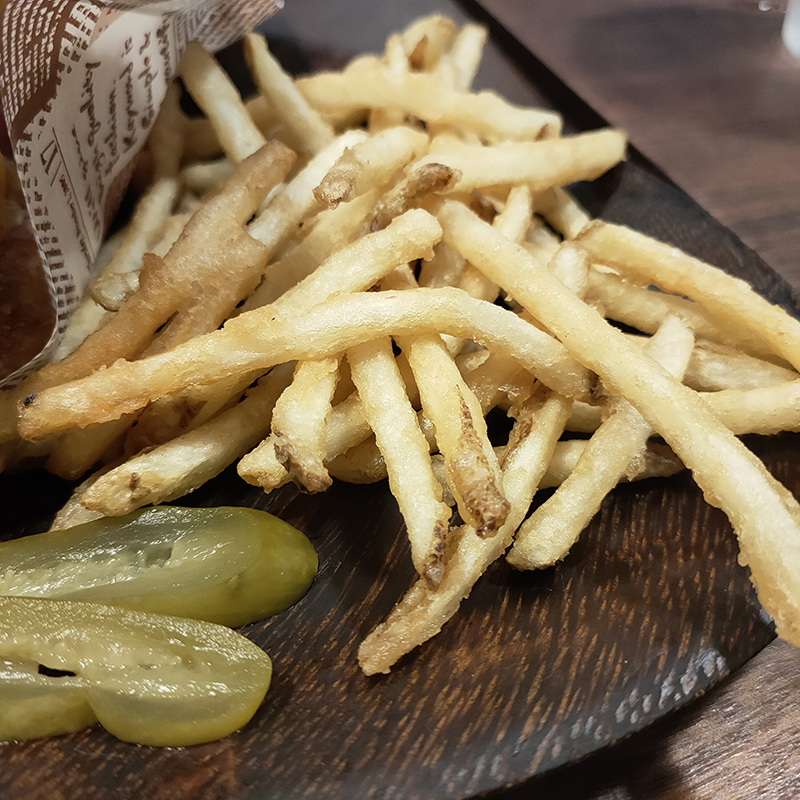 細身のポテトは表面がデコボコしていて手作り感がある。カリカリとした食感で旨い。これでビールが飲めればいいのだが…
