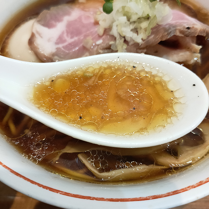 まずはスープをひと口。思ったよりも脂が浮いている。鶏油の強い香りが鼻腔を抜けていく。