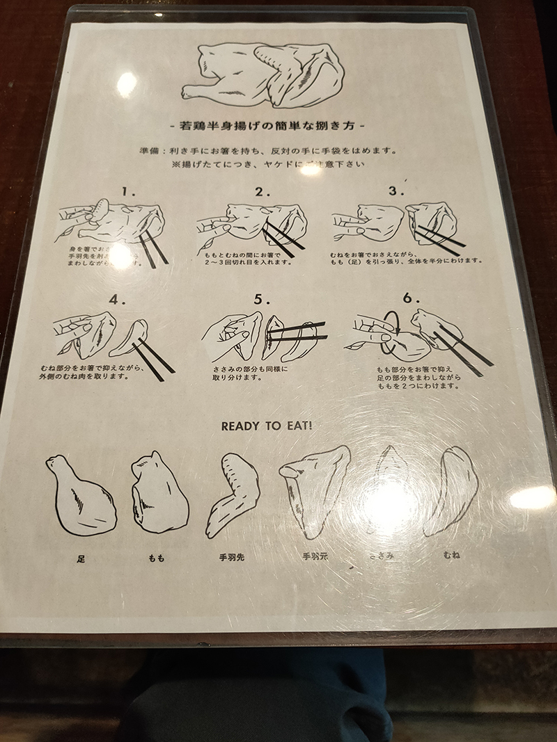 話は横道に逸れたが、笹身から胸肉、腿という流れで食べ進めた。油の状態がいいせいか、変な雑味がなく、腿肉はジューシーで火の通りは申し分ない。ただ塩味が中まで浸透していないのが少し残念。
