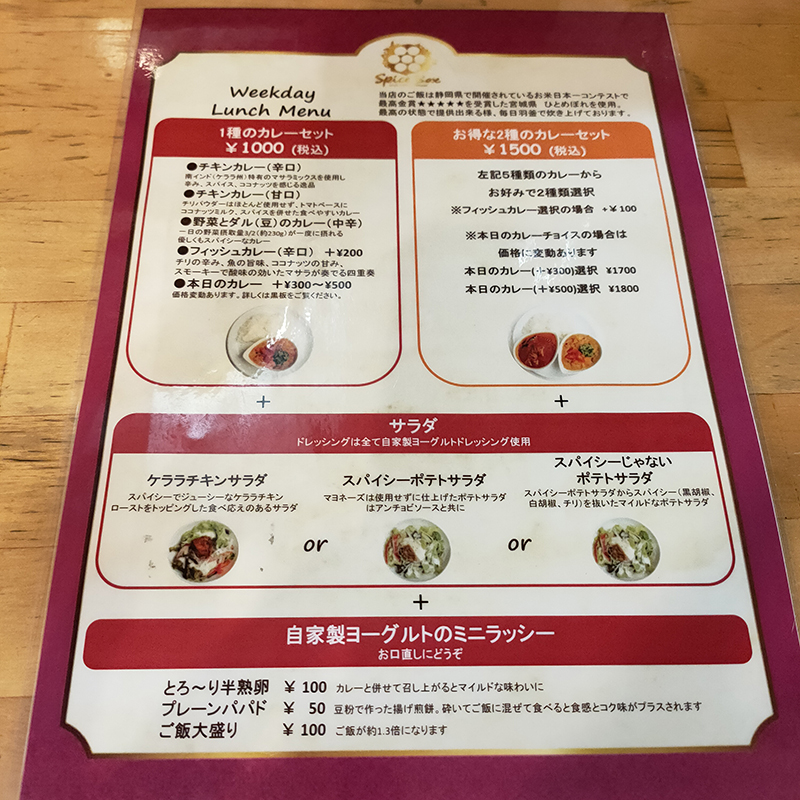 ランチメニューはまずカレーを1種類か2種類のどちらかを選択するのが基本パターン。ルーは5品の中からチョイスでき、定番の4つのうち、フィッシュカレーと本日のカレーのみ追加料金が発生する。因みにこの日はスペアリブのカレーでプラス500円。
