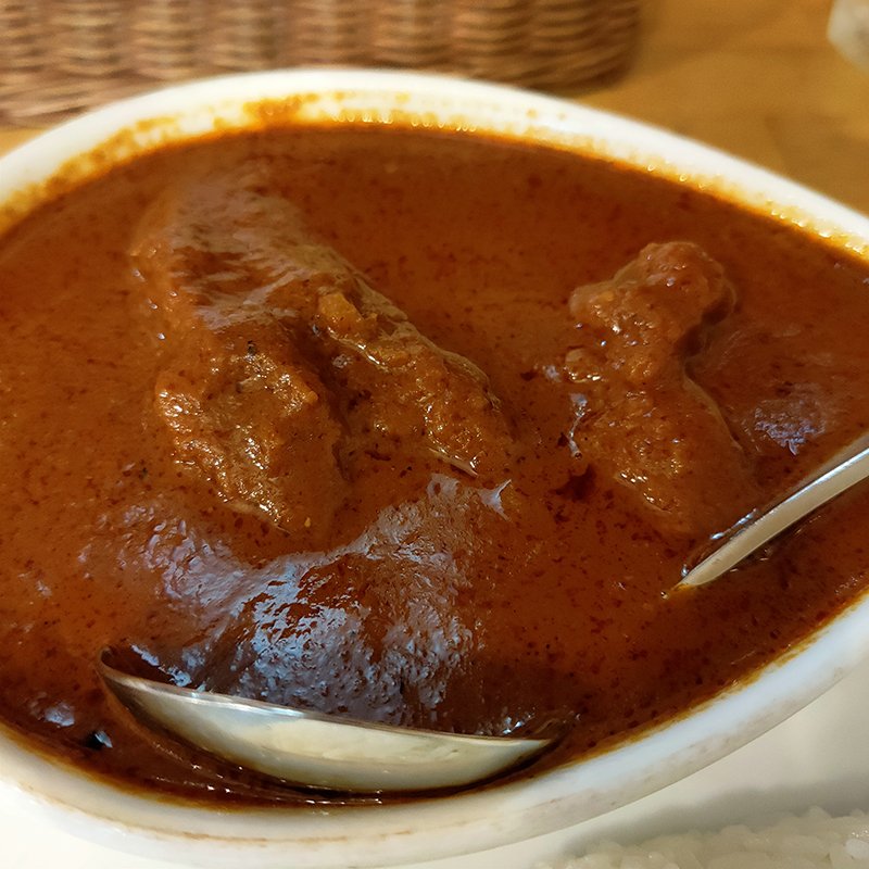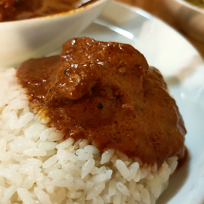 辛口だけに全体的に赤みを帯びていて、実際にしっかりと辛い。チリパウダーがやや多めのバランスだが、他のスパイスが突出することなく全体がほどよくまとまっている。クミンやコリアンダーといった特有の酸味を持ったスパイスが抑えられている印象で、そのあたり日本人向けにアレンジされている様だ。