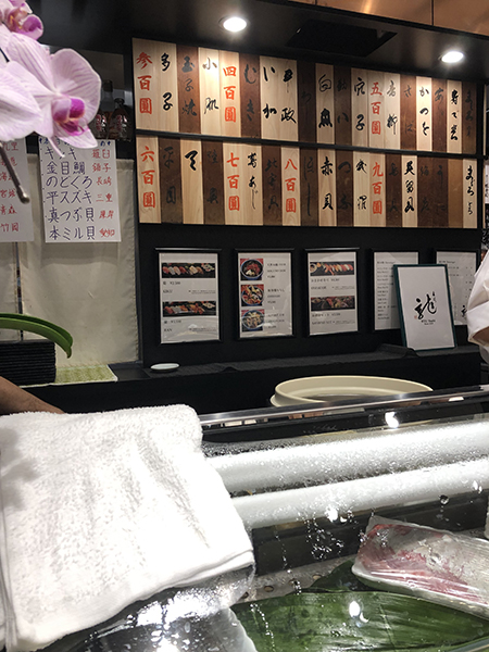 店内はL字型のカウンターで、奥にはお好みの値段が書かれている木札が掲げられている。