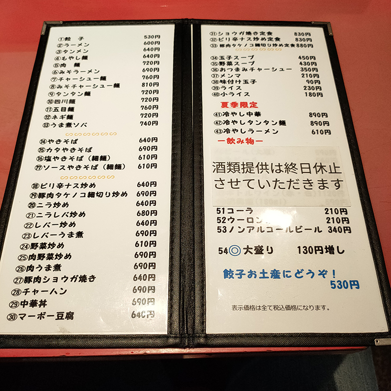 メニューを見るとラーメンからやきそば、ニラレバなどの炒めものなど町の中華屋さんらしい品揃え。