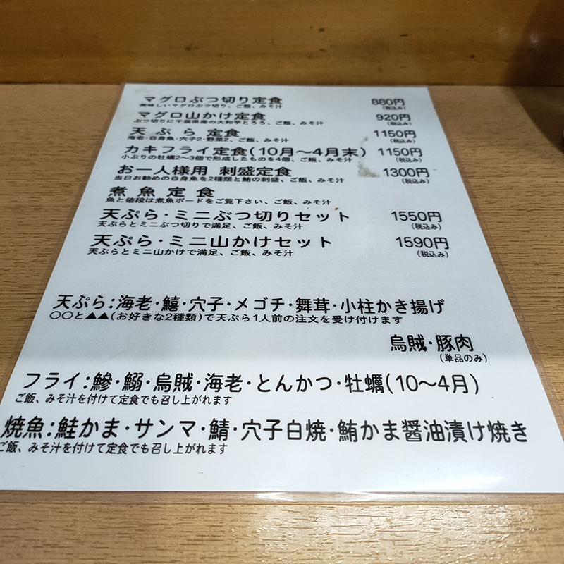 メニューは刺身、揚げ物、煮魚など魚料理のみ。煮魚はメニューとは別の小さなホワイトボードに本日の魚が記されている。この日は4種類。各々値段が異なる。