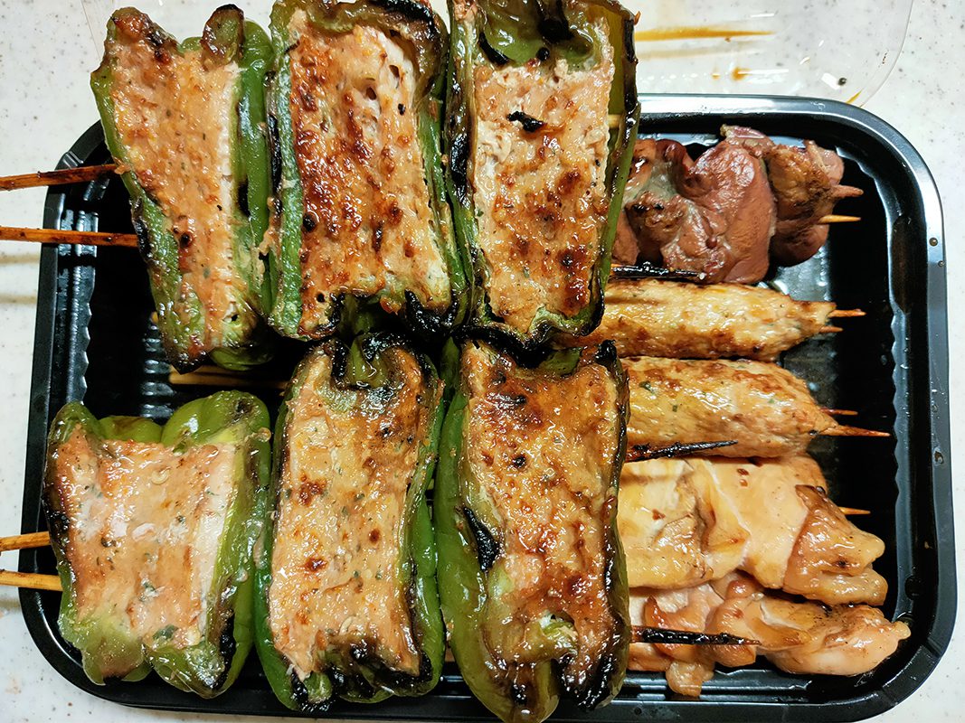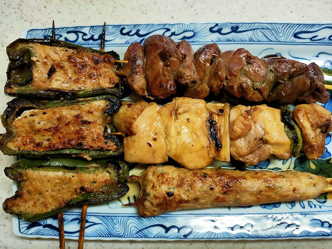 上からとりきも、やきとり、つくね。そして左側がつみれ(肉詰めピーマン)。