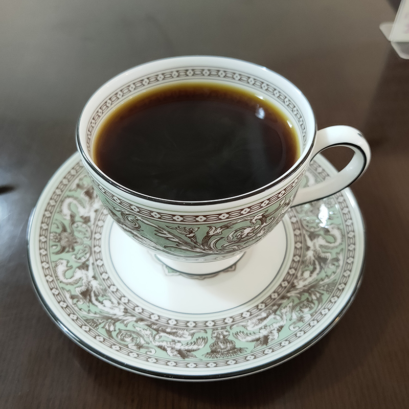 普通のブレンドもあるが、こちらの方がハワイコナなど高級な豆を使用しているとの話を伺ってこちらをチョイス。ウェッジウッドのカップで登場。