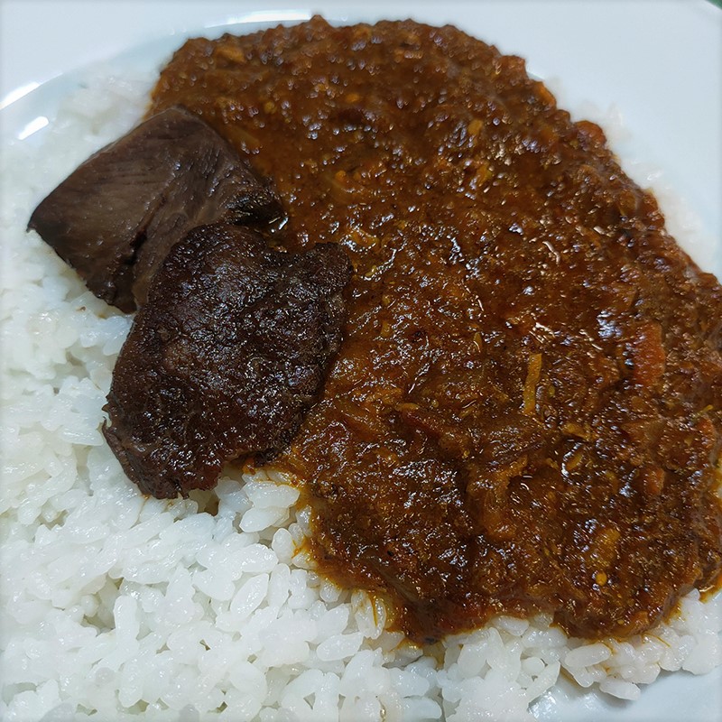 トロ肉は所謂、ブッフブルギニオン。赤ワインで煮込まれたものなのでカレーとの風味の違いがいいコントラストになっている。肉はトロ肉というくらい柔らかく煮込まれていて旨い。