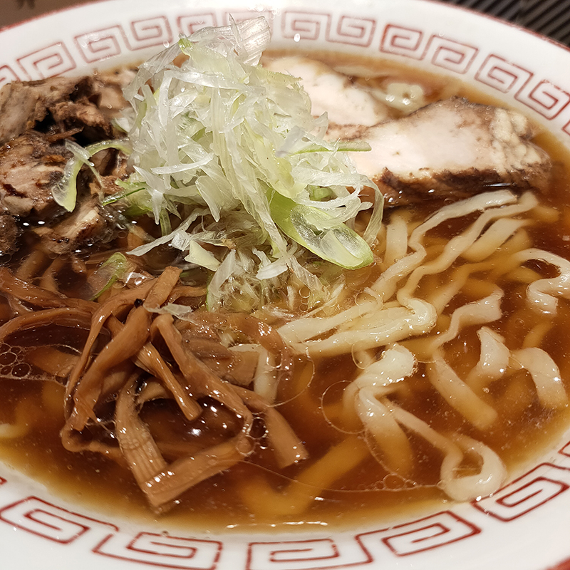 トッピングに切り落としチャーシュー50円を追加。具材はチャーシュー、メンマ、ネギと至極シンプル。