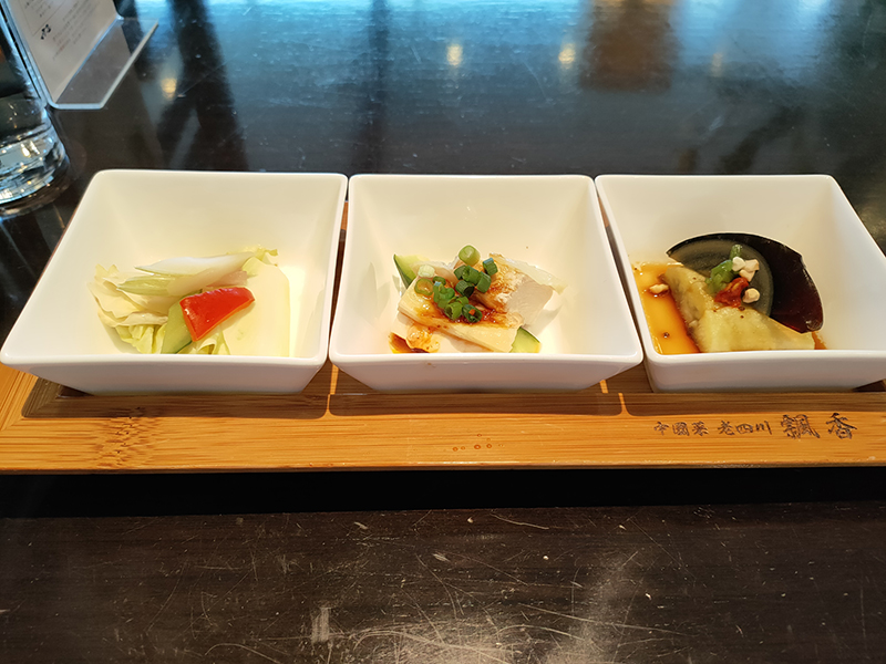 まずは前菜の盛合せ。左から特製ピクルス、鶏肉のニンニクソース、干し茄子とピータンの黒酢ソース。3種類の中では、真ん中の鶏肉のニンニクソースが秀逸。ちょっとお酒の一杯も飲みたくなるところだが、後のことを考え自重した。